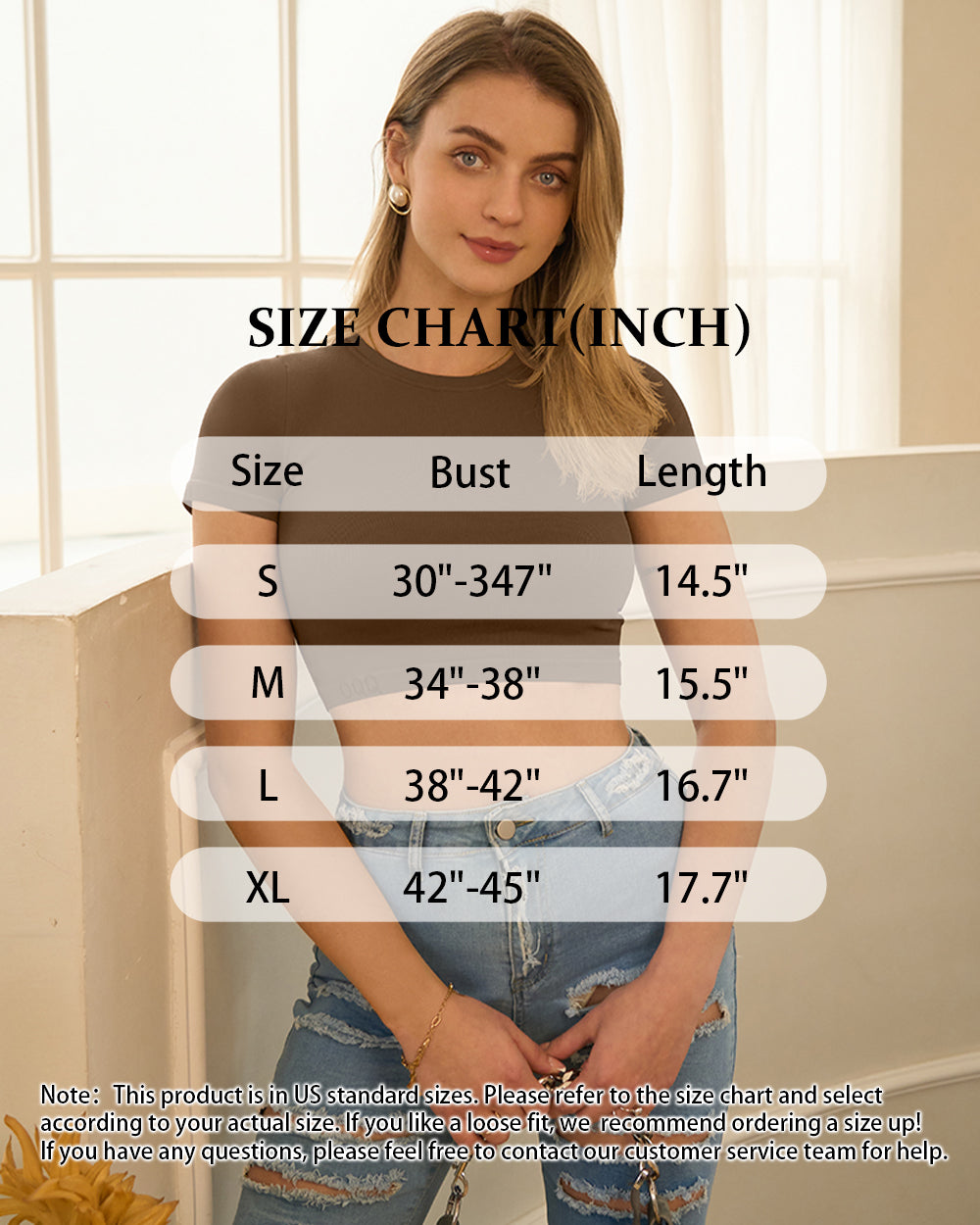 90% Nylon, 10% Spandex Machine Wash Non see through Short sleeve, crew neck, solid color. Super soft and high-stretch fabric Crop top Formfitting