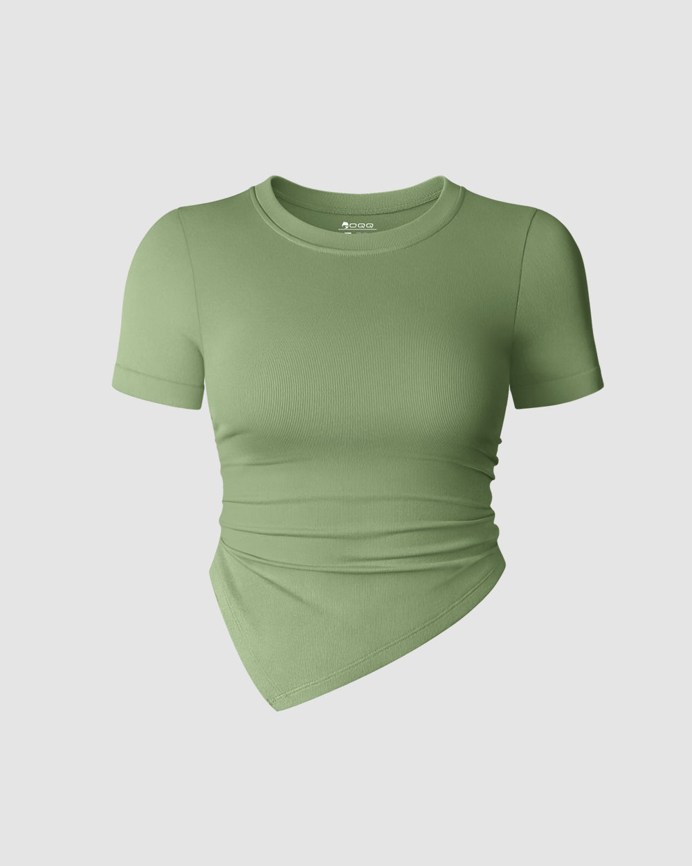 90%Nylon, 10% Spandex Machine Wash Llight weight, super soft and high-stretch fabric Breathable and stretchy fabric Ruched cropped length Perfect for daily casual wear versatile